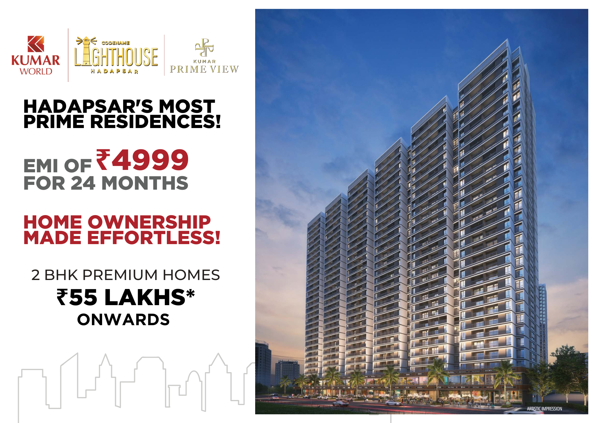Introducing Kumar Prime View previously know as Lighthouse, a prestigious residential development located at Hadapsar Square, spanning across an expansive 7.5 acres. This exceptional project features a collection of 9 towering structures, each offering 29 floors of luxury living. Designed for those who seek the best in modern living, Kumar Lighthouse offers premium 2 BHK flats, meticulously crafted to provide both style and comfort.